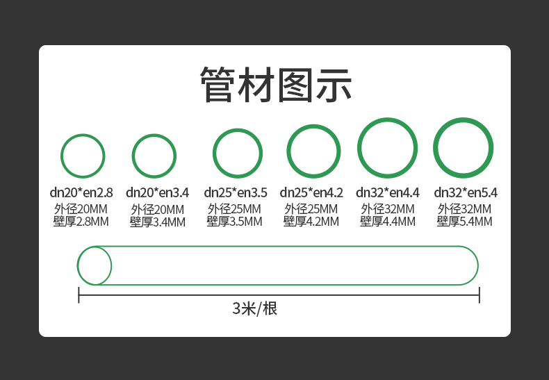 颜 色:dn20mm*en3.4mm、dn25mm*en4.2mm、dn32mm*en5.4mm